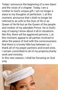 Today I announce the beginning of a new dawn and the close of a chapter. Today, I am a mother to God’s unique gift. I am no longer a slave to my thoughts of perfection. I, at this moment, announce that I shall no longer be referred to as wife to the Ooni of Ife or as Queen of Ile-Ife but as the Queen of the people and mother of my adorable Prince.to be cont.” she wrote via her known Facebook page.