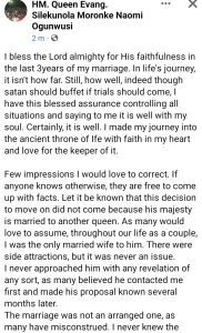 Few impressions I would love to correct. If anyone knows otherwise, they are free to come up with facts. Let it be known that this decision to move on did not come because his majesty is married to another queen. As many would love to assume, throughout our life as a couple, I was the only married wife to him. There were side attractions, but it was never an issue.