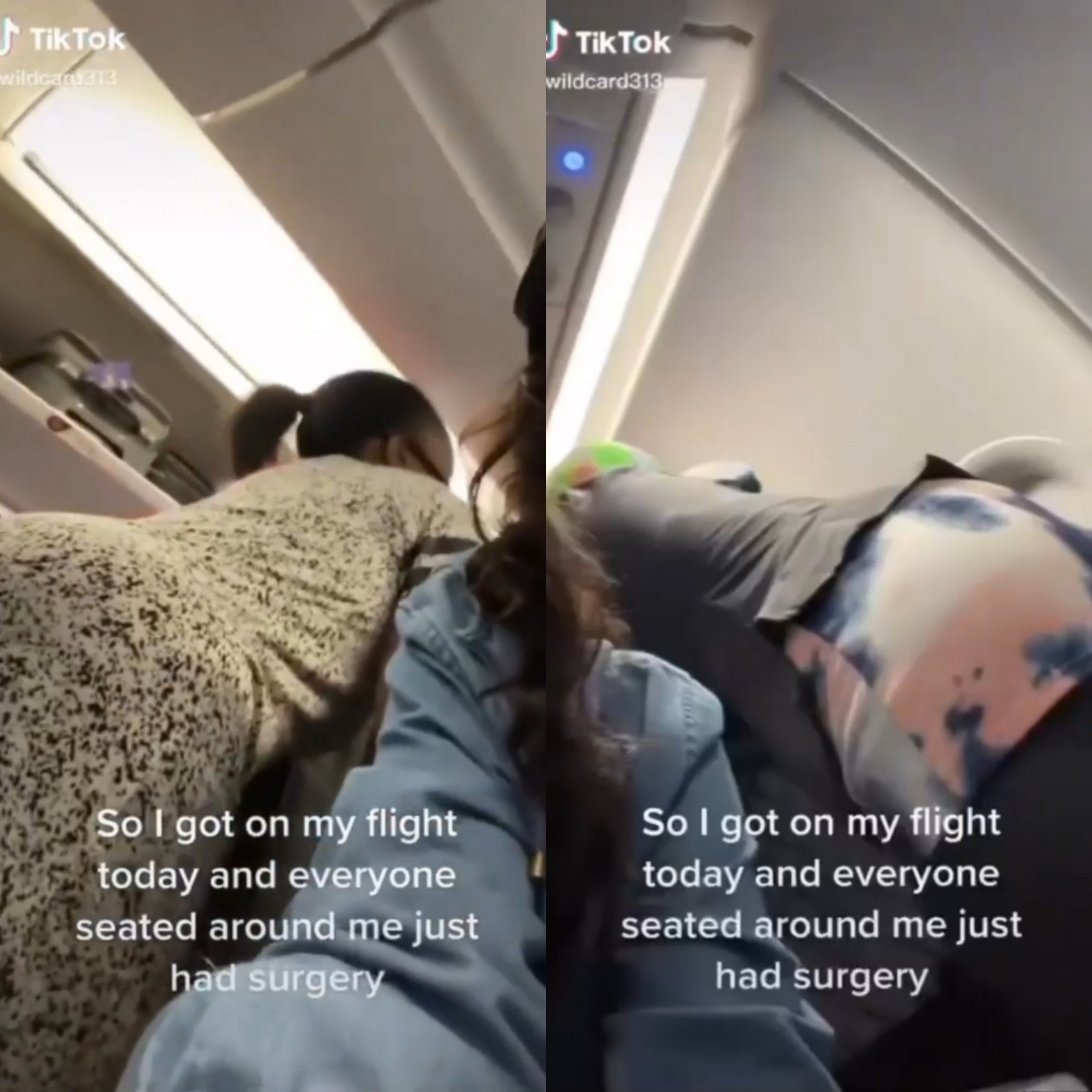 The woman filming wrote in the caption as she shared the video online: "So I got on my flight today and everyone seated around me just had surgery.